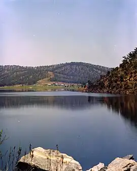 The Eungella Dam (21°08′12″S 148°23′20″E / 21.13667°S 148.38889°E / -21.13667; 148.38889 (Eungella Dam (wall))) is in the centre of the locality at elevation 550 metres (1,800 ft).[5] It creates Lake Eungella (21°10′00″S 148°24′00″E / 21.1666°S 148.4°E / -21.1666; 148.4 (Lake Eungella)).[6] It receives inflows from Broken River and other creeks.[4]