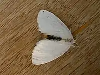 The wingspan is about 30 mm. Adults are completely white, except for the black compound eyes and some brown hairs along the inner margins of the forewings. The abdomen starts white, but often becomes black. There is a yellow tuft on the tail of the females.[2]