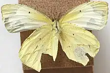 The upperside of the wings is pale yellow with a black forewing submarginal border outlining a "dog" or "wolf-face" pattern. The hindwing has a small outer margin black border. The male has a bright yellow patch on the leading edge of the hindwing. The underside of the wings is pale yellow in summer individuals and pale yellow with reddish markings or all reddish pink in winter individuals. The hindwing is sharply pointed.[4] The wingspan measures 1+14 to 2+14 inches (32–57 mm).[5][3]