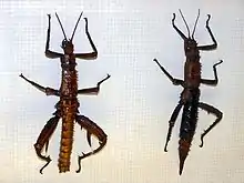 Eurycantha horrida can reach a length of about 12 centimetres (4.7 in) in males, of about 14 centimetres (5.5 in) in females.[3] The body color ranges from pale green to brown. The young insects are glossy greenish. These ground-dwelling stick insects resemble bark or rotten wood. They have numerous small spines on their body and on their hind legs. Both sexes are wingless and look very similar. They exhibit the sexual dimorphism of many phasmids, as the males are darker, smaller and thinner and have enlarged hind leg femurs with a curved spine or thorn on the underneath side. Females are also brighter than the males and have a larger abdomen tipped with a beak-shaped ovipositor with which they lay the eggs in damp soil.[3]