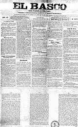 Apart from Chapel-Zuri, in the mid-1890s Echave-Sustaeta was related to some other periodicals, especially the Bilbao daily El Basco, owned by the Carlist politician Celestino Alcocer.[52] He kept sending correspondence to El Correo Español, first from Zaragoza[53] and then from Bilbao.[54] For some time he appeared briefly related to an ephemerical Carlist periodical from Vitoria, El Alavés,[55] and to a short-lived weekly from Logroño, La Lealtad Riojana.[56] His best-known articles of the time are these published in Chapel-Zuri and El Basco; they are related to increasingly bitter polemics with ideologue of the nascent Basque nationalism, Sabino Arana.[57] Technically the polemics was about traditional separate legislative regulations, named fueros, but in fact it was related to understanding of the Basque identity; Arana formulated it in racist and anti-Spanish terms, Echave-Sustaeta understood it as own separate self within the Spanish cultural and political framework.[58] Echave-Sustaeta's stand earned him personal congratulations on part of the claimant[59] and recognition far beyond Vascongadas, e.g. in Valencia.[60] However, it is rather the pamphlet written in response by Arana which made it to history books.[61]