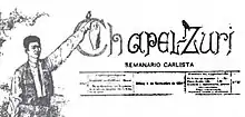 During initial phase of his press career he used to sign as "E. de Echave Sustaeta",[70] but in the mid-1890s he switched to "E. Echave-Sustaeta", and this is how he became referred to.[71] He also published under initials and pen-names, especially "Altobiscar", "Fermín de Altobiscar", and "Fraude".[72] Politically he confronted particularly the mainstream Conservatists, charged with alleged innate tendency to close shady deals with liberals and dubbed "mestizos".[73] Echave-Sustaeta's term at El Pensamiento Navarro coincided with the period of Carlist political domination in the region; the party controlled 5-6 out of 7 Cortes mandates, allocated to Navarre, but none of the dedicated works discusses the newspaper's role.[74]