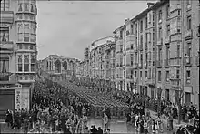 In August 1937 the post of civil governor was ceded by colonel Fernández Ichaso to Eladio Esparza; earlier marginally related to Carlism, at the time he already represented "a new vision".[182] He provided a counter-balance to the oriolista domination,[183] reinforced following a Falangist counter-action and complaints centrally.[184] In early October 1937 Echave-Sustaeta was replaced as FET Delegado Provincial by José María de Elizgarate; an official statement read that he had been asking for release for some time.[185] Carlists lost domination in the new FET executive;[186] the fall of 1937 marks the beginning of "verdadera nueva política" in Álava, i.e. replacing generic right-wing domination with systematic implementation of new Francoist rule.[187] Diputación remained as "último reducto de los oriolistas en Alava",[188] lambasted by Falangists as rotten nucleus of "old politics".[189] It did not last for long; though as late as in January 1938 Echave-Sustaeta was engaged in maneuvers intended to save local Gipuzkoan prerogatives,[190] in March 1938 he quoted health reasons and resigned from the self-government;[191] the moment marked the end of "diputacion oriolista".[192]