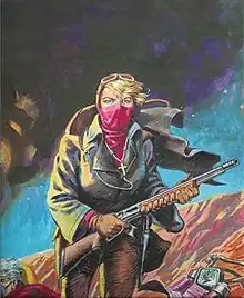 A short introductory story in Comico's Primer #6, and two issues, Guns of Mars (loosely based on the Spaghetti Western film genre) and Hate Boat, were published by Comico Comics in 1984. An ownership dispute in 1985[1] led to Evangeline leaving Comico, resulting in a 1986 special from Lodestone Comics that reprinted the two Comico issues with additional pages bridging the stories (an epilogue to Guns of Mars and a prologue to "Dinosaur Farm" from the First Comics series), and then a 12-issue run from 1987 to 1989 published by First Comics.[2] Hunt co-wrote and illustrated only the first few issues of the First Comics series, leaving to pursue her design and illustration licensing work for HA! Henson Associates and Macmillan Publishing on Raggedy Ann and Andy. In an interview with the Comics Buyer's Guide, Judith Hunt said that (after she left), "the comic [Evangeline] lost its original complexity and feminist standpoint and became just another excuse for depictions of gratuitous sex and violence".