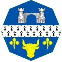 Azure a fess Ermine in chief a port between two towers Argent and in base a bull's head caboshed between two trefoils slipped.