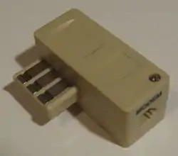 F-010 or T plug or PTT plug is a type of telephone plug and matching socket. The F-010 standard originated in France and is used there (overseas departments and territories included) and in other countries, including Algeria, Andorra, Bhutan, Burkina Faso, Chad, Comoros, Republic of the Congo, Djibouti, Egypt, Equatorial Guinea, Gabon, Grenadines, Ivory Coast, Madagascar, Mali, Mauritania, Mauritius, Monaco, Morocco, Niger, Rwanda, Senegal, Somalia, Togo and Tunisia.