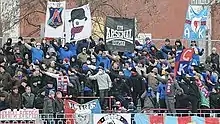 Due to predominant right-wing football supporters in Ukraine, the Arsenal supporters "Mad Rebels" lean strongly towards the anti-fascist movement and in the majority perceived as left-wing supporters.[62] Colors of the Arsenal fans coincide with those of the Ukrainian Soviet Socialist Republic's flag, while the Kyiv Arsenal factory is associated with pro-Bolshevik sentiment during the Kiev Arsenal January Uprising in 1918 following which Kyiv was overrun by the armed forces of Soviet Russia. The Arsenal supporters could also be associated with Partizan Minsk who have similar political beliefs.[62] Arsenal fans were interviewed by the BBC in 2012 for a documentary on football hooliganism called Stadiums of Hate,[63] before the UEFA Euro 2012, however their interviews were omitted from the final edit, leading some people to criticise the BBC for ignoring them in order to push their message of fascism further.[62][64]