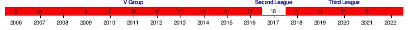 The club was dissolved in 2004 only to be re-established later that year. It remained in third division until 2016, when it was promoted.