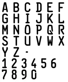 - ↑ Schrift für Kfz-Kennzeichen. Bundesanstalt für Straßenwesen, Bergisch Gladbach, Germany.