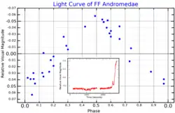 ![]() Two light curves for FF Andromedae are shown. The main plot shows the variation in brightness as the star rotates, and the inset plot shows a flare that occurred on 18 October 1991. Adapted from plots in Bopp et al. 1977[1] and Peres et al. 1993.[2] | |