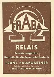 FRABA was founded by Franz Baumgartner in 1918 as the FRABA Fabrik elektr. Apparate. In the same year, Franz Baumgartner received his first patent for a “Petri Switch”. This patent would be the first of many. The company specialized in producing mechanical relays for electrical alarm and safety devices. Until 1943, the company was based in Cologne-Klettenberg with two departments. From 1919 onward, the production and manufacturing expanded. Franz Baumgartner's brother, Adolf Baumgartner, was a key figure in the family company, leading one of the two departments and writing numerous technical articles on FRABA's products in several magazines and gazettes in the years to come.[3][4]