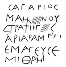 The Farasa bilingual inscription, originally known as the Zindji-Dérè or Zindji-Dara inscription,[1][2] is a bilingual Greek-Aramaic inscription found along the Zamantı River outside Farasa, Cappadocia (Greek: Φάρασ(σ)α, then a small Greek-speaking enclave with its own dialect known as Pharasiot Greek), known today as Çamlıca village in Yahyalı, Kayseri).[3][4] It was identified in modern times by Anastasios Levidhis of the town of Zindji-Dérè, and first published in 1905 by Josef Markwart.