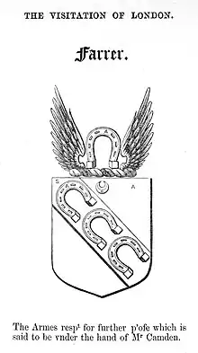 There is an apparent symbiotic relationship between the surname and armorial bearings issued to various houses of Farrar/Farrer/Ferrar, all of which have, on a bend, three horseshoes and some have a horseshoe on the crest. Such as Fairer of Warcorp Tower, Westmoreland[14]: 43 And pedigrees recorded in the Visitation of Surrey[15]: 157–158 and Visitation of Hertford.[16]: 58 The arms of Nicholas Ferrar.[17]