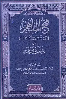 Fath al-Mulhim bi-Sharh Sahih al-Imam Muslim (Arabic: فتح الملهم بشرح صحيح الإمام مسلم) is a three-volume Arabic commentary on Sahih Muslim, written by Shabbir Ahmad Usmani before 1916. Usmani commenced the writing of the book in 1914 due to the absence of commentaries on Sahih Muslim, unlike Sahih al-Bukhari, which had commentaries according to the Hanafi school. He dedicated himself to bridging this gap and continued his work until his demise.[1][2] He was only able to complete three volumes of the book before his passing. The first and second volumes were published in 1933 and 1935 respectively, while the third volume was published in 1939.[3] Taqi Usmani later took up the task of completing the remaining portions of the book in 1976, ultimately finishing it in 1994 in six volumes known as Takmilah Fath al-Mulhim bi-Sharh Sahih al-Imam Muslim.[4]