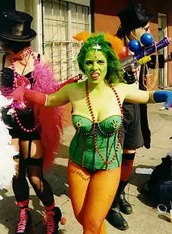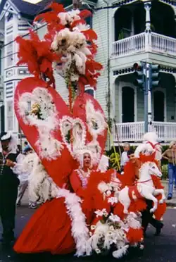 The Faubourg Marigny neighborhood of New Orleans, Louisiana is one of the most active on Mardi Gras Day, with many elaborate costumers strolling the streets. This part of town is relatively little visited by tourists compared to other areas with active celebrations.