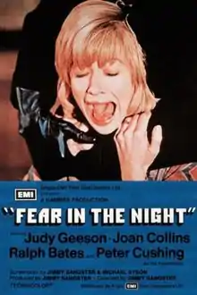 Fear in the Night (also known as Dynasty of Fear and Honeymoon of Fear[2]) is a 1972 British psychological horror film directed, produced, and co-written by Jimmy Sangster and produced by Hammer Film Productions. The film stars Judy Geeson as a psychologically-fragile woman who, upon relocating to a rural boarding school where her husband has taken a job, finds herself being tormented by a mysterious figure with a prosthetic arm. Peter Cushing and Joan Collins, respectively, also star as the school's mysterious headmaster and his wife.