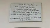Above the door of Federico Sacco's house in Fossano, affixed to the wall, there is a plaque commemorating the tenth anniversary of the scholar's death which shows an incorrect date of death and place: Turin, 14 October 1948.