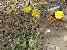 The firm and large flower heads sit individually on top of an almost leafless, hairy stalk of up to 10 cm (4 in) long. The involucre is about 1 cm (2⁄5 in) across, and consisting of two strict rows of equally long bracts. Those in the outer row are about 1 mm (0.04 in) wide, lance-shaped, roughly and glandular hairy with a fringe of hairs near the tip. Those in the inner row narrowly obovate, 11⁄2 mm wide, with a broad papery margin and eventually hairless. Many female ray florets with a light blue, rarely yellow, strap, are 2 cm (4⁄5 in) long and 21⁄2 mm (0.1 in) wide, with a hairy tube. Many bisexual, softly hairy disc florets with a yellow corolla of about 5 mm (1⁄5 in) long. In the center of each corolla are five anthers merged into a tube, through which the style grows when the floret opens, hoovering up the pollen on its shaft. At the tip of both style branches is a narrowly triangular appendage. Around the base of the corolla are many white pappus bristles with teeth, that are easily discarded. The dry, one-seeded, indehiscent fruits called cypselae are large, 3 mm (0.12 in) long and 11⁄2 mm (0.6 in) wide, inverted egg-shaped, yellowish brown to brown, with a strong marginal ridge, with thick, 1⁄2-1 mm (0.02–0.04 in) with short, robust hairs.[2][4]