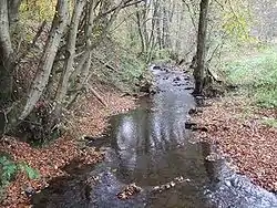 At the left there is the Thommer Bach in the Nossernvalley with the Fell Exhibition Slate Mine (Besucherbergwerk Fell).