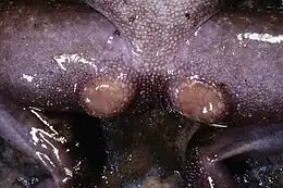 During mating, the femoral glands' placement on the male's ventral surface of the thigh suggests that they may contact the female's dorsal skin, implicating the glands in reproductive signalling.[7] Gland secretions may influence female behaviour, potentially stimulating oviposition and aiding intra-species recognition.[8] The variation of the femoral glands in the species Nyctibatrachus major may reflect hormonal regulation akin to thumb pad elaboration, a common secondary sex characteristic in male frogs. The size and function of femoral glands in N. major show seasonality and a correlation with reproductive activity, paralleling the strict seasonal changes in the Western Ghats environment. The presence of femoral glands in males of this species with small snout–vent lengths indicates that the development of these glands begins at a relatively early stage.[9]
