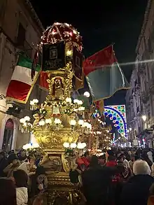 The next day, after the "Messa dell’Aurora" (Mass at Dawn), a reliquary-bust of St. Agatha atop a silver fercola or carriage leaves the cathedral and is pulled through the neighborhoods, passing places associated with the life of the saint. The devoted followers wear the traditional white tunic that covers the body down to the ankles and is tied at the waist with a rope. The celebrations continue through the night.[4] Gaily decorated kiosks sell traditional street food such as arancini (rice balls) and beccafico sardines (with breadcrumbs, pine nuts and raisins).[2]