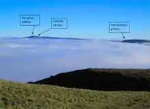 To the south of the main peaks are two more broken north-facing scarps, that of the Carboniferous Limestone and, to its south, that of the Twrch Sandstone, commonly referred to as the Basal Grit or Millstone Grit.[2] These three suites of rock all dip southwards into the regionally important South Wales Coalfield basin.