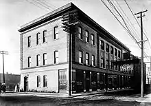 Originally built as the lobby and retail frontage for the Electric Theater in 1912, the Paramount Building at 507-513 South Main Street is a two-story commercial block that has brown brick walls, a concrete foundation and a flat roof. In 1966 and 1967 flat metal sheathing was applied to the front facing upper story to give it a more modern look,[11] but this has since been removed and the front of the structure has been restored to a more original appearance.[2] Originally a large theater auditorium that could seat more than 1,500 was attached to the back of the existing building, but it was demolished in November and December 1965[12] and the theater lobby was reassigned as a retail space. Prior to the introduction of sound films in the late 1920s, the theater showed silent films and hosted vaudeville acts.[13] In 1930 the theater changed its name from the Electric Theater to the Paramount and ended all silent films and vaudeville acts. In 1926 Wurlitzer Opus organ #1443 was installed in what was then the Electric Theater, but it was later removed and sold.[14]