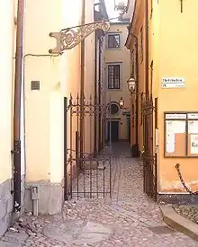 Finska Kyrkogränd (Swedish: "Finnish Church Alley") is a blind alley in Gamla stan, an old town in central Stockholm, Sweden. Leading south from Slottsbacken, the alley separates the Finnish Church from the Tessin Palace. It was also named after the vicinity to the former. It forms a parallel street to Bollhusgränd and Källargränd.