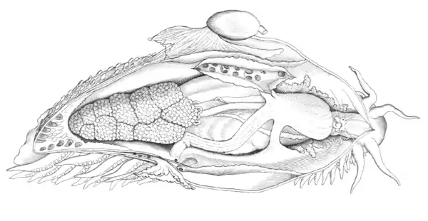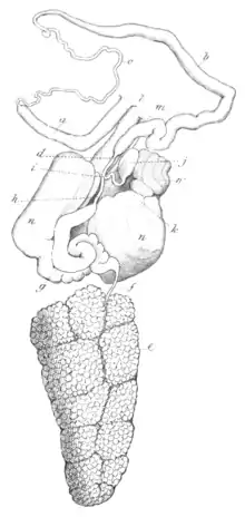 The mucous gland for the secretion of the mucus-like envelope of the eggs, is composed of two lateral lobes separated on the upper surface by a deep fissure. These lobes are semipellucid and are formed of a coarsely convoluted tube, that is on its right side anterior portion opake and flesh-coloured. The two lobes open into the female channel, which is wide and quite long.[4]