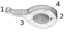 ![]() Drawing of internal view of the one jaw of Fiona pinnata. Cutting edge is on the top left. There is visible the point, where the jaws are articulated in the top center. Expanded lobe on the dorsal margin for muscular attachment is on the top right. |