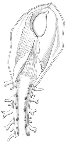 On laying open the dorsal skin, the reproductive organs are found, as usual, to occupy much of the visceral cavity, having the stomach and intestine lying above, and the buccal mass in front. The penis is placed in advance of the other parts, and, in its retracted state, is long, rather slender, and linear. The penis has a conical form during mating. The outer extremity of the penis leads through the wall of the visceral cavity to the external opening, and on its way the sheath or external covering of the penis becomes firmly attached to the muscles of the skin.[4]