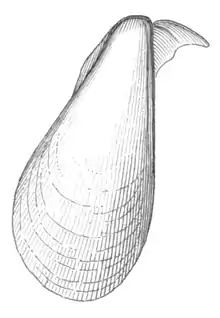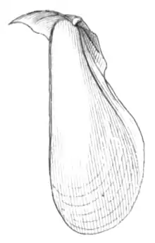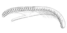 ![]() Drawing of external view of the one jaw of Fiona pinnata. Cutting edge is on the top right. Expanded lobe on the dorsal margin for muscular attachment is on the top left. |