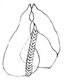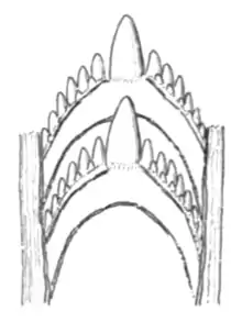 The radula is supported on a fleshy ridge that rises up from the floor of the buccal cavity, and extends in the antero-posterior direction from the oesophagus towards the anterior opening. The radula is long, linear, and strap-formed, and is composed of semicircular and crescent-shaped denticles (tiny teeth) of an orange colour.[4] There are 40 rows of teeth in radula: 15 oldest denticles in the anterior end, then there are 22 denticles after the angle and three incomplete denticles in the sheath in the posterior end of the radula.[4][18] The radula formula is 0+1+0, which means that there is only a single central denticle in each row.[9] There is a pointed spine in the centre, and 6[9] or 6-7 smaller spines on each side of the denticle. There are also sometimes minute spines at the base of denticle's outer margin. All the spines are a little bent, and have their points directed backwards towards the oesophageal opening.[4] The whole length of the radula is 2.6 mm.[18]
