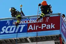 The first event is the stair climb. This Challenge consists of a 42 lb. hose which must be carried up six flights of stairs.[4] This activity replicates a five-story building where water is needed at the top. The 42 lb. hose is a standard 100 ft., 1.75 in. thick. hose. The stairwell consists of six sets of stairs, each with ten steps. The firefighter must carry the hose up the stairs and place it in a container box on the top story of the stairwell. The hose may not touch the ground at any point before the firefighter places it in the container box.[5] Once the 42 lb. hose is in the box, the firefighter may proceed with the second event, then descend the stairs, touching each tread and holding on to both handrails on each side of the stairway. On reaching the floor, the firefighter goes onto the next event. Their time is continued and any penalties are added to the final time. Penalties include not touching every step or holding onto the hand rails, which results in a 2-second time addition to their final time per occurrence. The firefighter may also be disqualified if at any time the hose comes off or slides out of the container at the top of the stairway.[5]