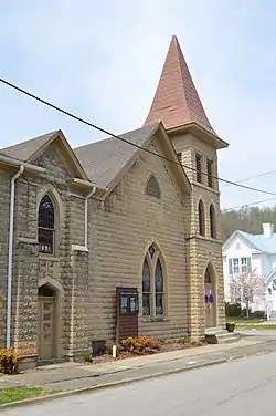The original building was built in 1907 in a Late Gothic Revival style and added to the National Register in 1989. It was located on the corner of Fourth and College Street. The church occupied the building on Fourth Street until October 1, 1967, when the church congregation moved into the present structure on the corner of Third and College Streets.[2]