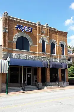 The First National Bank is a historic commercial building at 109 East University Street in Siloam Springs, Arkansas. It is a two-story brick building, trimmed in stone. Its ground floor is recessed in an arcade supported by square posts, and is separated from the second floor by a stone belt course. The upper floor windows have round stone arches, with two narrow bays projecting slightly. The cornice has corbelled brickwork, and is topped in a few places by stone caps. The building is Siloam Springs' only significant example of Romanesque Revival architecture.[2]