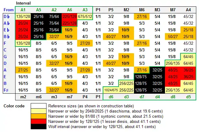 - 1 2 Wolf intervals are operationally defined herein as intervals composed of 3, 4, 5, 7, 8, or 9 semitones (i.e., major and minor thirds or sixths, perfect fourths or fifths, and their enharmonic equivalents) the size of which deviates by more than one syntonic comma (about 21.5 cents) from the corresponding justly intonated interval. Intervals made up of 1, 2, 6, 10, or 11 semitones (e.g., major and minor seconds or sevenths, tritones, and their enharmonic equivalents) are considered dissonant even when they are justly tuned, thus they are not marked as wolf intervals even when they deviate from just intonation by more than one syntonic comma.
