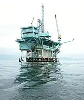 Unocal Platform B, a fixed platform constructed in 1968 in the Santa Barbara Channel, California. Water depth is 190 feet (58 m).