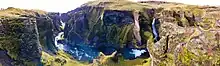 The canyon has steep walls and winding water. It is up to 100 m (330 ft) deep[1] and about 2 kilometres (1.2 miles) long.[2] It is located near the Ring Road, not far from the village of Kirkjubæjarklaustur.[3]