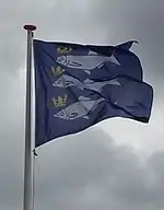 The flag of Scheveningen is in azure with three right swimming[1] herrings of silver, each herring with a three-leaved yellow crown, floating above the head.[2] The origin of the coat of arms is a matter of debate because Scheveningen is not, and never has been, an autonomous municipality. Since the village was founded in 1284, Scheveningen has always been a part of the municipality of The Hague.