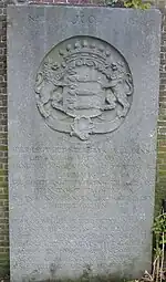 Tombstone dated 1780 of the Baron De Huybert in Ter Navolging cemetery, with the engraved family insigna