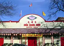 A South Vietnamese flag being flown over a Buddhist temple in the U.S. state of Illinois, alongside the U.S. flag.