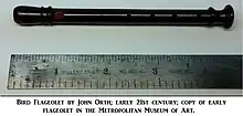 The flageolet is a woodwind instrument and a member of the family of duct flutes that includes recorders and tin whistles. Its invention was erroneously[1] ascribed to the 16th-century Sieur Juvigny in 1581.[2] There are two basic forms of the instrument: the French, having four finger holes on the front and two thumb holes on the back; and the English, having six finger holes on the front and sometimes a single thumb hole on the back. The latter was developed by English instrument maker William Bainbridge, resulting in the "improved English flageolet" in 1803.[3] There are also double and triple flageolets, having two or three bodies that allowed for a drone and countermelody. Flageolets were made until the 19th century.[4]