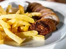 The flamenquín is a traditional dish from Andújar (Andalusia) made with slices of jamón serrano wrapped in pieces of pork loin, coated breadcrumb batter, and deep-fried. It is often garnished with French fries and mayonnaise. A common variation replaces the loin with boiled ham. It can also be made with other fillings, such as fish, cheese, or poultry.