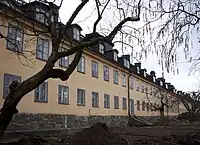 The experience from the staff's first ten years of operations had shown the need for the division of work into organized departments. The first departments within the staff were in 1896 the Mobilization and Statistics Department as well as the Communication Department. According to the proclamation issued in 1896 concerning the organization and activities of the staff in peacetime, the staff would have the task of: drawing up plans for the mobilization of the navy and dealing with matters concerning the navy's enabling to fulfill its task; to pay close attention to the training, exercises and serviceability of the navy personnel and to make suggestions for improvements in these respects; to closely monitor the development of the naval warfare both within Sweden and outside the country and to carry out naval history research; to prepare, after receiving the assignment, the necessary statutes, regulations, instructions and guidelines for the service in the navy; to carry out investigations and issue statements on naval matters, which are referred to the staff, and to collect all necessary information concerning both naval personnel and equipment as well as maritime communications as well as such institutions within the country, which are intended for the promotion of general shipping. When the space within the property on Birger Jarls torg 11 became insufficient, the Fleet Staff was assigned a premises at Långa raden 4 on Skeppsholmen.[4] Due to the creation of the Swedish Coastal Artillery, the name of the staff was changed from 31 December 1907 to the Naval Staff.[5]