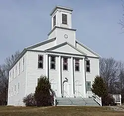 The hall was built in 1811 by a Baptist congregation established in 1794, and is only preceded in the county by the Middlebury Congregational Church, completed in 1809. In 1854, the present belfry was constructed, modifying the basic design of the exterior, which is based on a church depicted in Asher Benjamin's The Country Builder's Assistant, published in 1797. The Baptist congregation dissolved in 1903, and the building was acquired in 1904 by a Methodist congregation. In 1944 the Methodists combined forces with the local Quaker organization to share use of the latter's building, and this building was sold to the local Grange chapter, which had been organized in 1940.[2] The hall continues to be used by the Grange as a community meeting and event venue.
