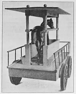 The recently founded South Carolina Canal and Railroad Company ran a competition for horse-powered locomotives in 1829. A$500 prize was offered for the best machine to be demonstrated.[1] The Flying Dutchman was a locomotive designed and built in New York in 1829 by the engineer Christian Edward Detmold.[2][1] It had a bench along either side that faced outwards, while the driving force was provided by a horse running on a treadmill in the center, connected to the axles by a series of gears. The Flying Dutchman was trialled by the railroad in 1830 and awarded the prize, having successfully carried 12 passengers at a speed of 12 miles per hour (19 km/h).[1] The Flying Dutchman was in service on a 6-mile (9.7 km) section of the railroad, within months of the first section of track being started on January 9, 1830.[3][2][4] A model of the Flying Dutchman is in the collection of the Smithsonian Institution.[1]