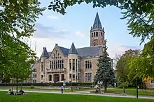 The Fondation Émile and Louise Deutsch de la Meurthe is the oldest house in the Cité Internationale Universitaire de Paris. Founded in 1925, it consists of six residential buildings and one central administrative building, which also houses a bell and clock tower. In total there are 393 beds for 341 rooms: 243 single rooms, 27 double rooms, 56 studios, 10 two-room apartments and 5 three-room apartments.[1] Common spaces include 15 shared kitchens, a laundry room, a TV room, and game room with billiards and ping-pong. The central building also contains a great hall, a small lounge, a classroom, and a music room with frescoes painted by Maurice Guy-Loë.[1] The front of the administrative building has an exit gate and is often referred to as the 37 Boulevard Jourdan gate.