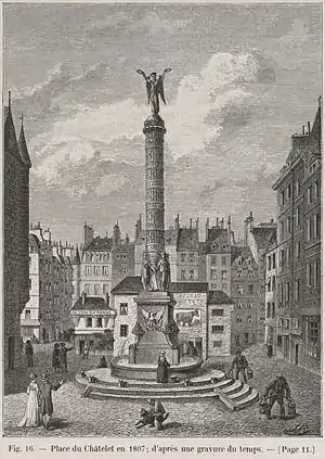 The fountain in 1807 before the final demolition of the Grand Châtelet and before the addition of the base in 1858.