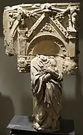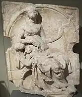 The first fountain in the Piazza del Campo was completed in 1342, after hydraulic construction had led water to the site. Underground pipes brought water to the site from 25 kilometers away.[1] Legend holds that the fountain was met with much joy, thus it was given the name Gaia or joyous. Others suggest the term Gaia refers to the Latin term for "bride", and that the fountain was dedicated to the bride of God and patron of Siena, the Virgin Mary.[2] The fountains, plates, and statues conflate Roman matrons' cardinal virtues, with a central relief of the Madonna and Child, curiously framed by stories of Genesis.